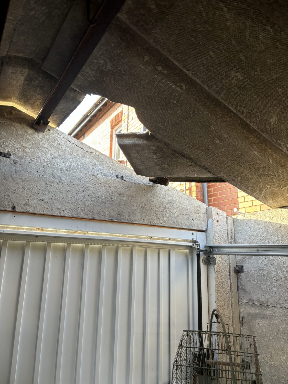 A pitched garage roof in Northampton has suffered storm damage, with one panel broken in half and another potentially leaking. The roof may contain asbestos, requiring specialist repair or replacement.