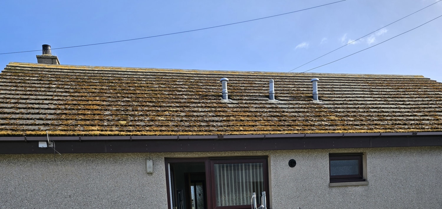 :Clean and seal a moss-covered tiled roof on a detached home in Lossiemouth. Includes gutter cleaning to ensure proper drainage.